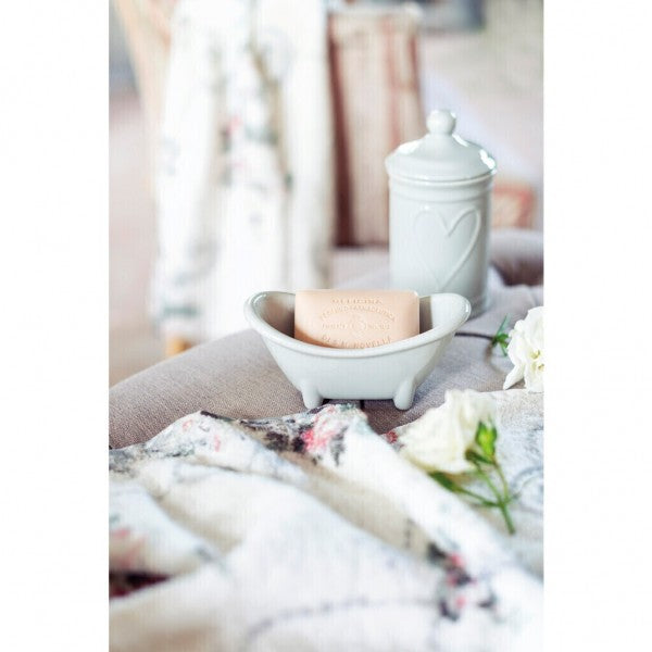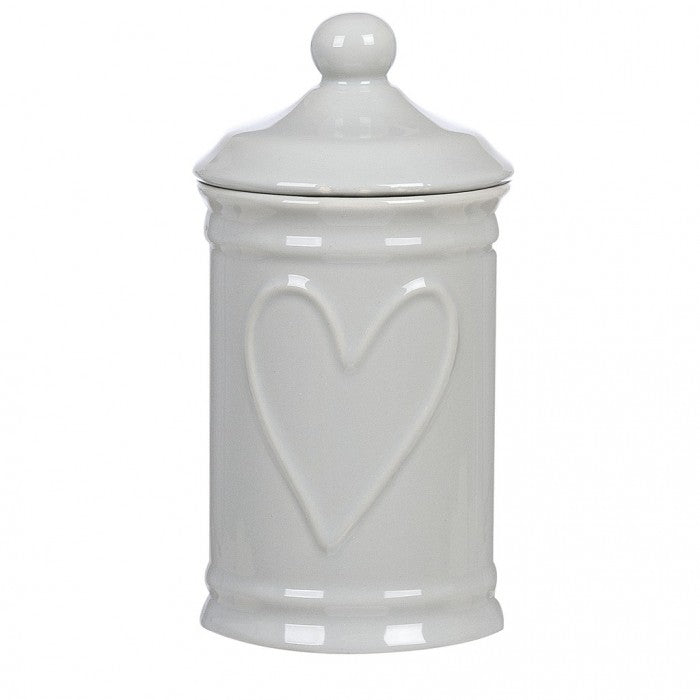 Barattolo in ceramica con coperchio Blanc MariClo'. In rilievo una decorazione a forma di cuore. 8.50 x 15 x 8.50 cm