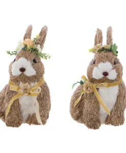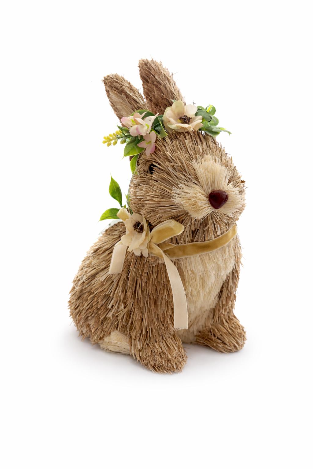 Il simpatico coniglietto, realizzato in paglia, è decorato con una ghirlanda di fiori ed un fiocco di velluto. Perfetto come decorazione Pasquale!