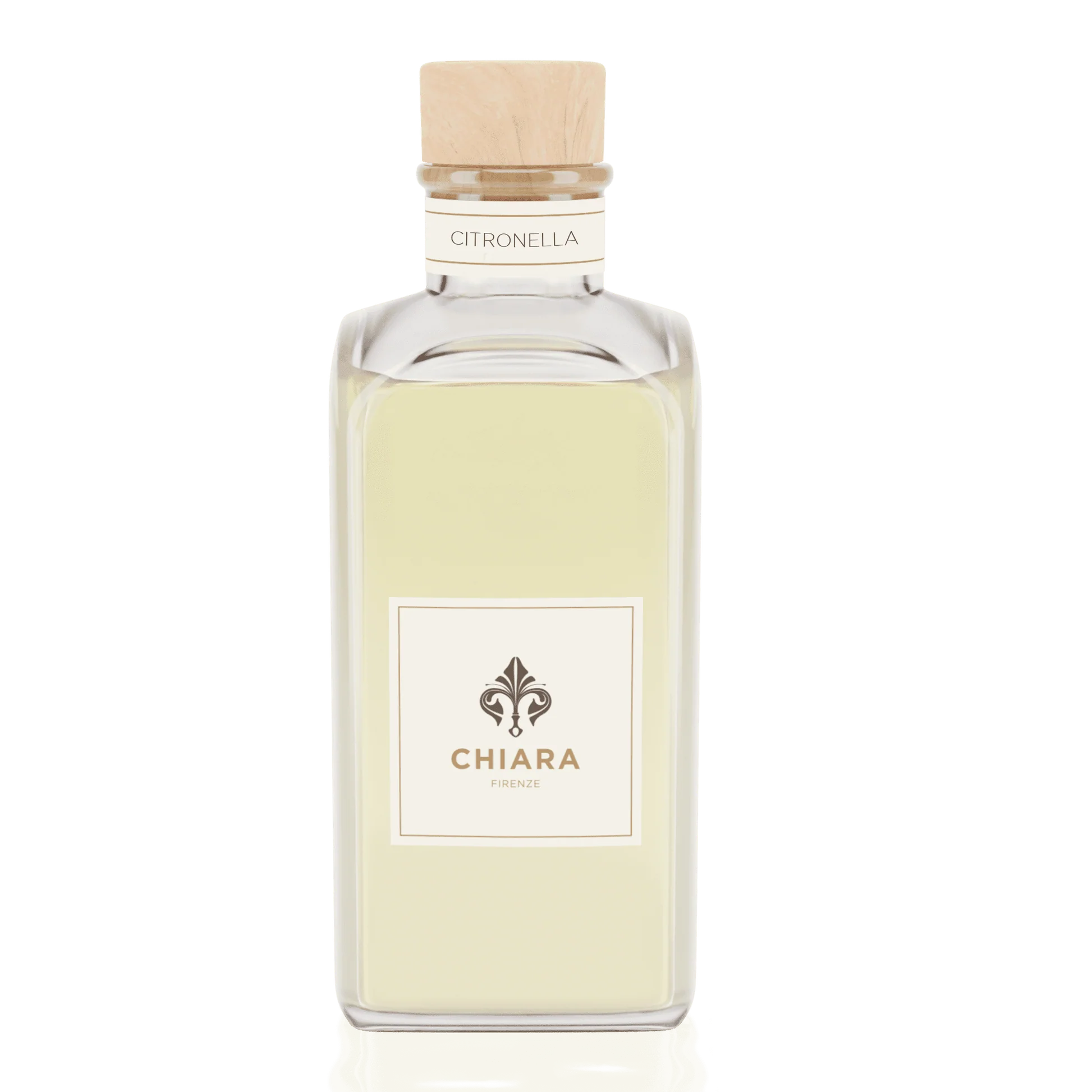 Fragranza leggera e fresca con aromi di menta piperita, citronella, basilico e vetiver. Profumi che trasportano i sensi nel verde della natura.